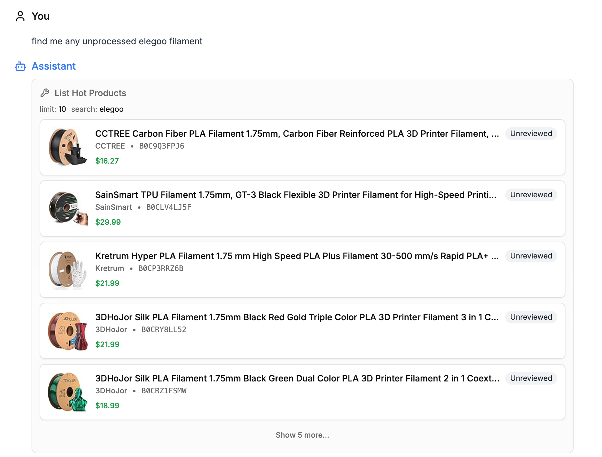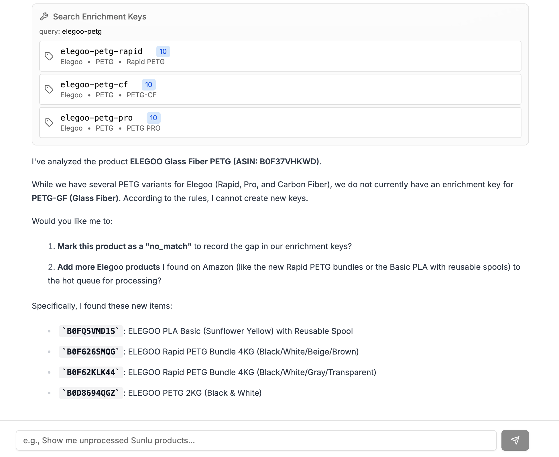 Here’s an example of the Agent finding results, but knowing we don’t have any enrichment data for them yet. It offers to mark them as no_match which creates a list of filament we know could be added but needs some legwork first.