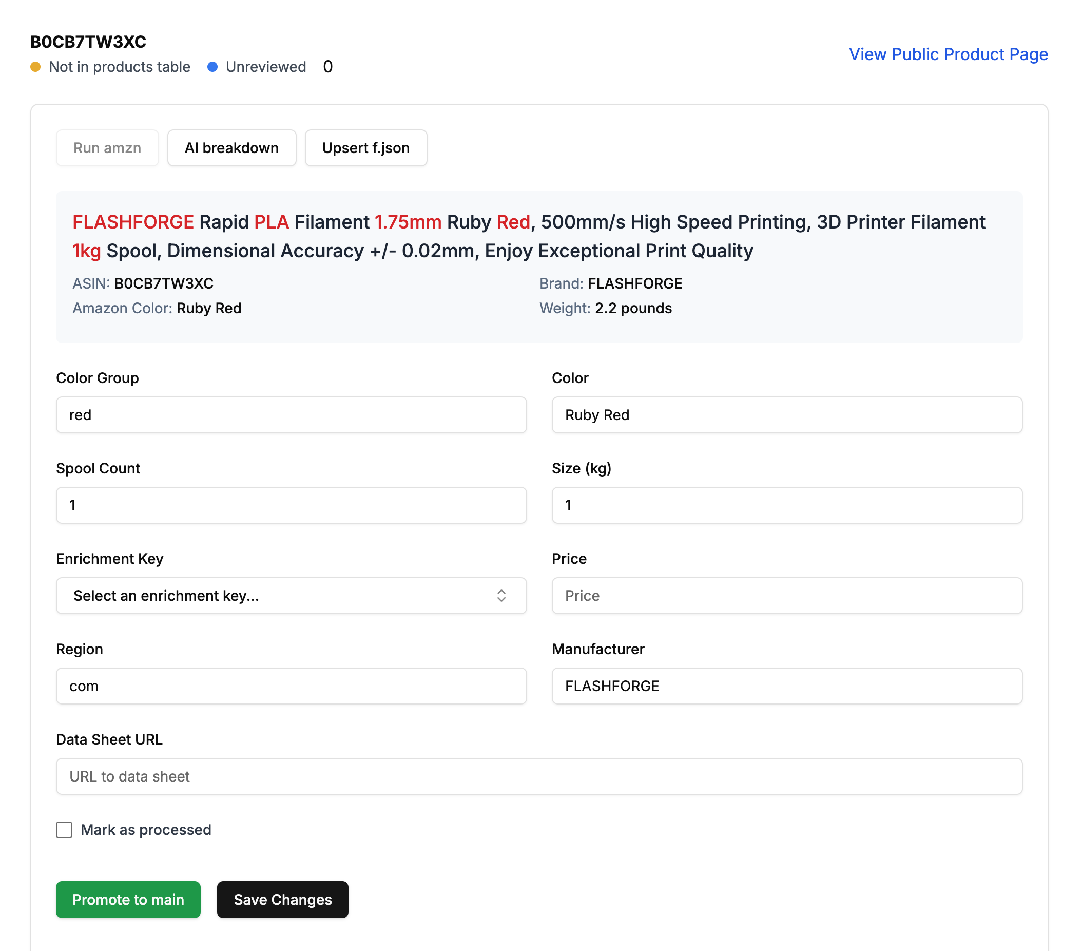 To begin with, I processed new products by running a local script and adding them to an Excel Sheet, adding the missing data, and uploading a CSV of new products. Eventually I started building an admin interface around this so I could build towards a fully automated flow. New products are surfaced with recurring automated searches. They land in a list that I called Hot Products. They need to be matched to enrichment keys, and have some metadata added - colors, price, spool count etc.